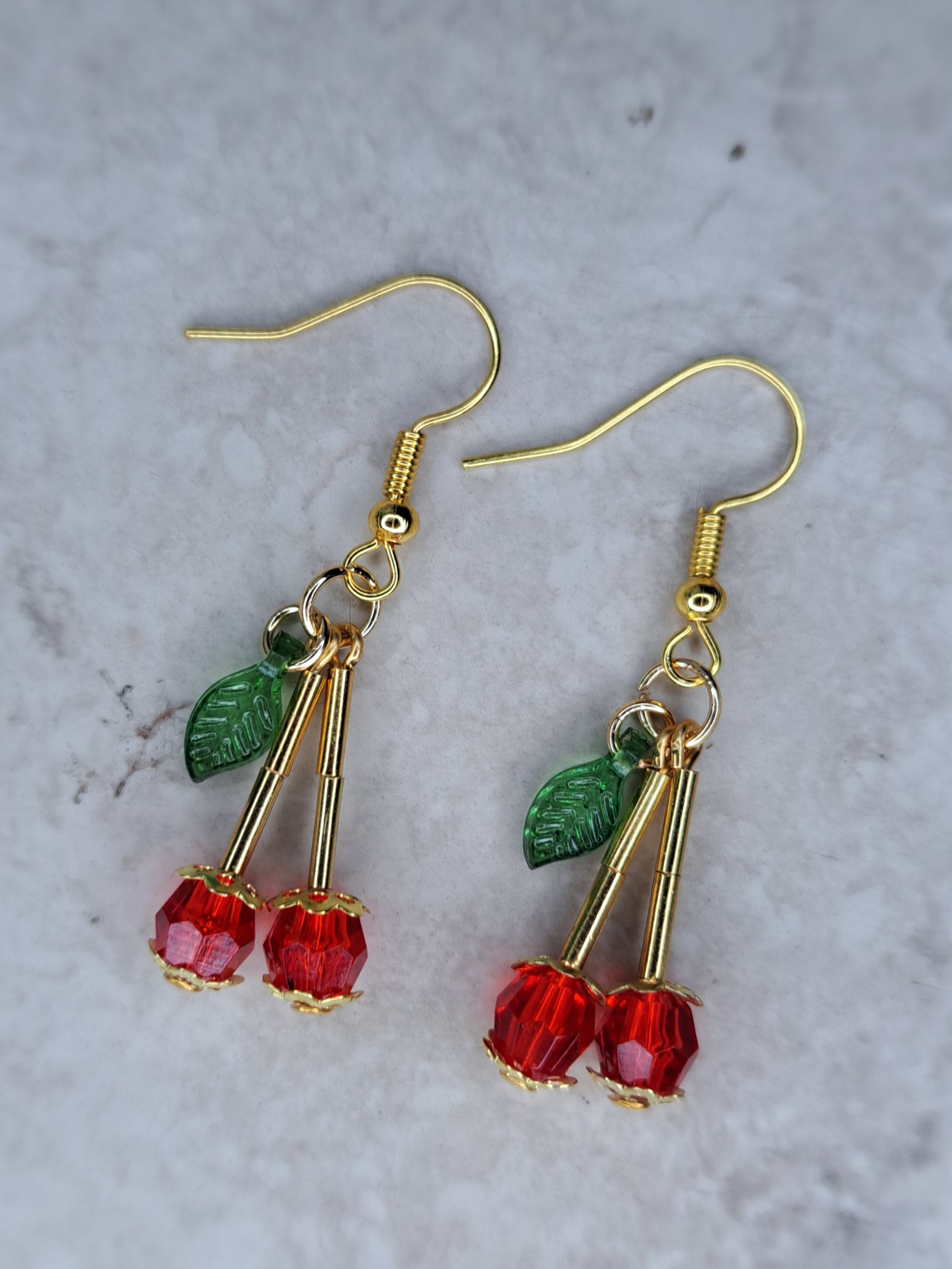 Cherry and gold stainless steel dangle bead earrings