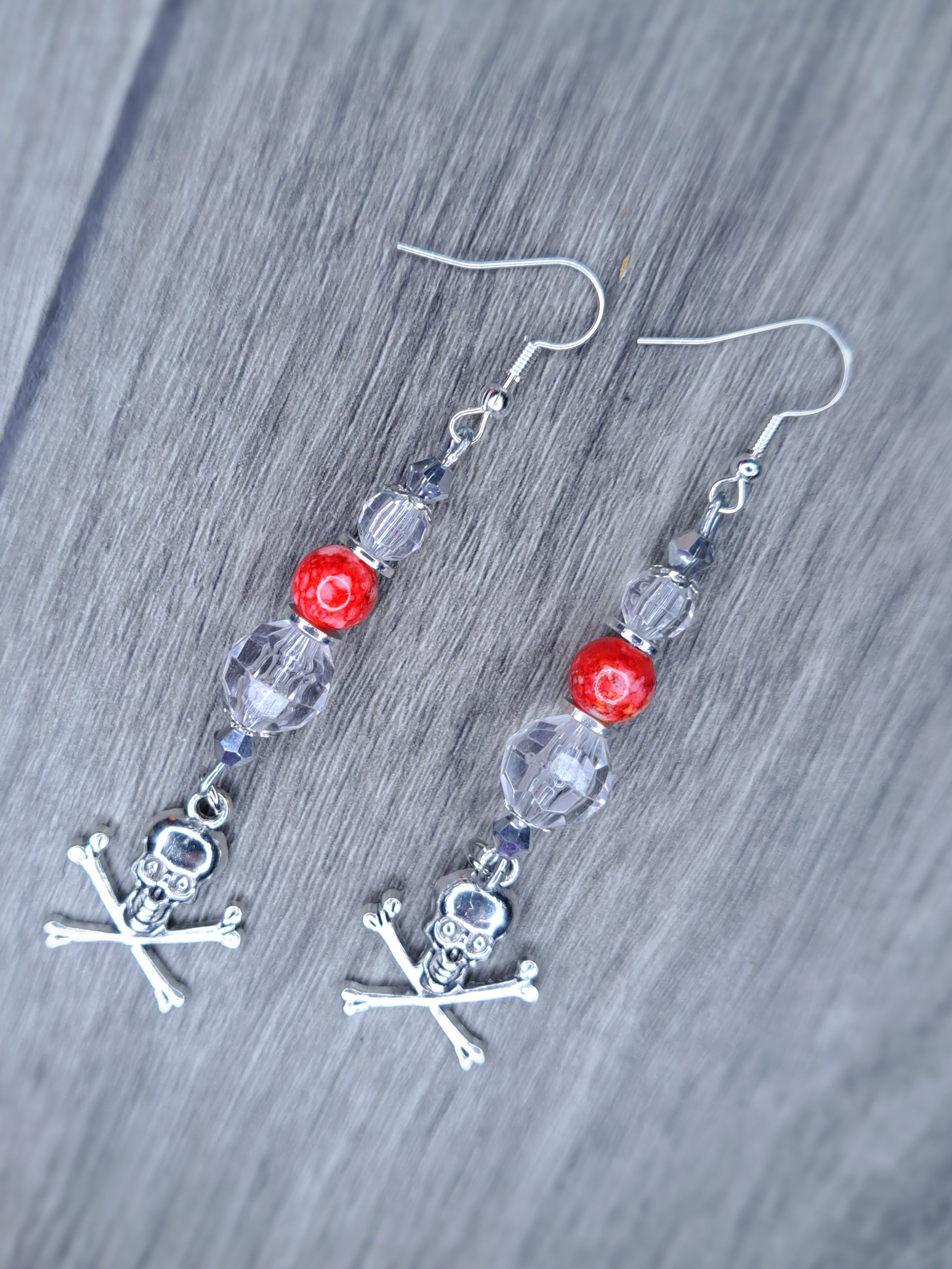 Clear and red beaded stainless steel skull cross bones dangle earrings