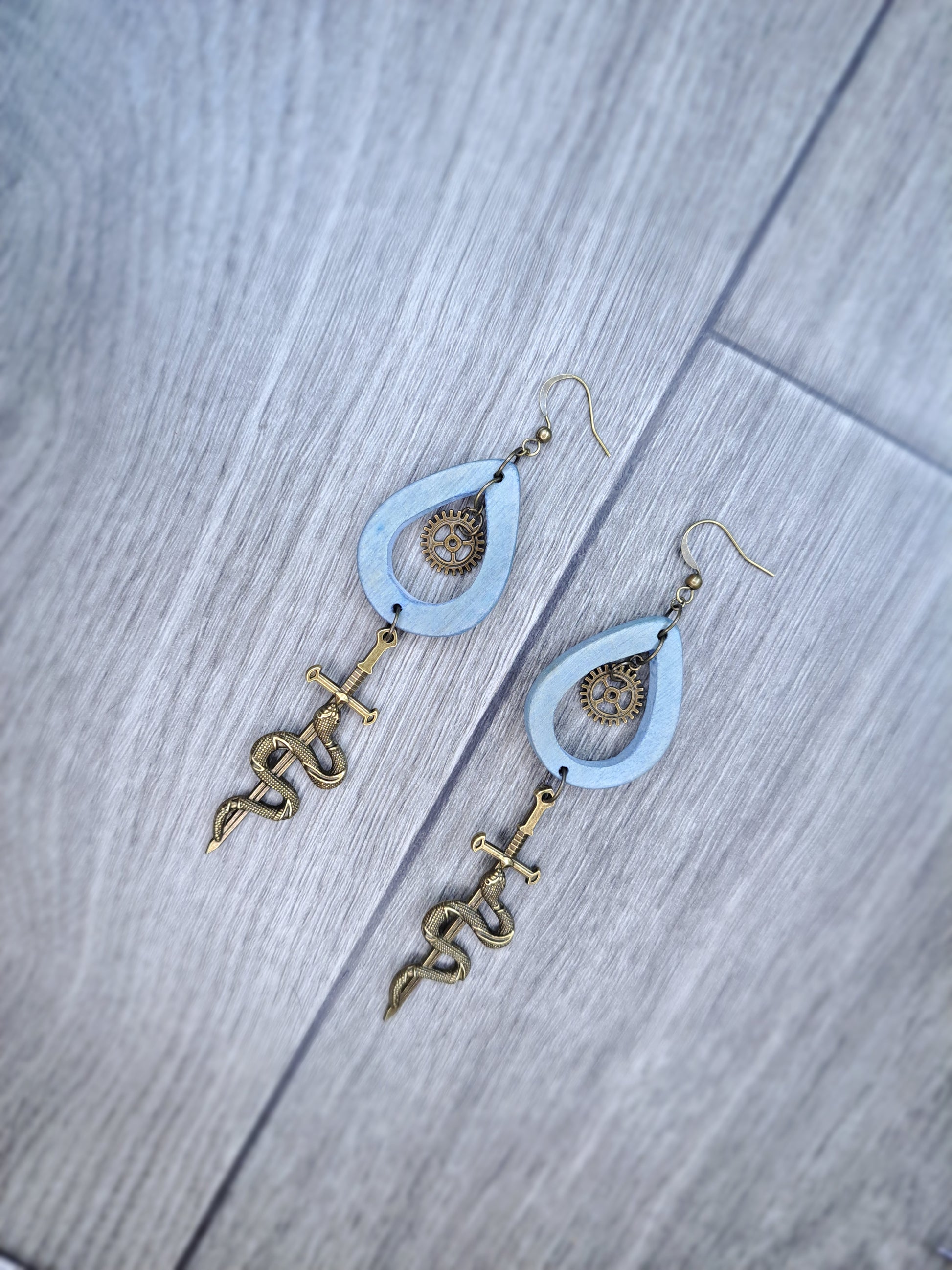 Blue wood & bronze sword snake heart hoop earrings